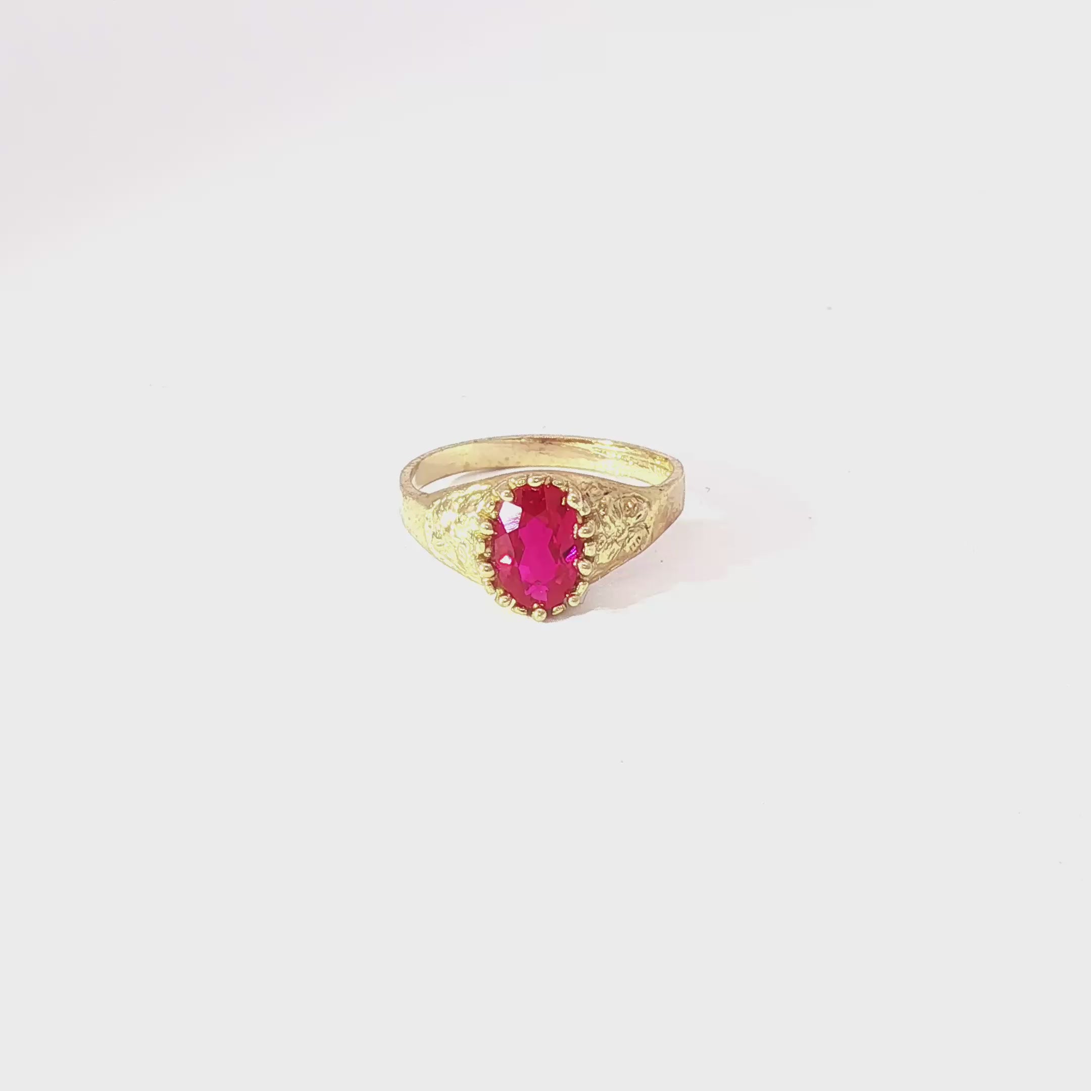 A petite treasure with vintage soul. This 10K yellow gold ring cradles a vivid ruby-red cubic zirconia in an elegant oval cut. Its delicate, hand-finished details bring heirloom charm to a child’s jewelry box or fine miniature collection. Verified through the Auri Petra XRF Authenticity Process for trusted quality and gold purity.