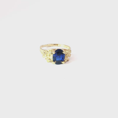 This petite ring evokes vintage craftsmanship, featuring ornate goldwork and a radiant blue CZ centerpiece.