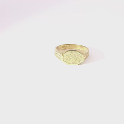 A petite treasure in solid 10K yellow gold with a distinctive textured octagonal face and polished, engraved band. Every ring is non-destructively verified through the Auri Petra XRF Authenticity Process for confirmed gold purity and quality.